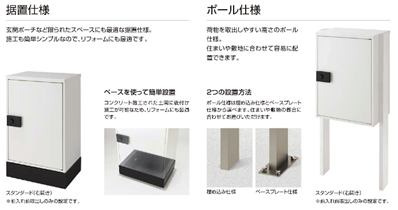 据え置き仕様とポール仕様の設置スタイルで選べる宅配ボックス。