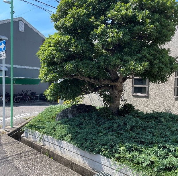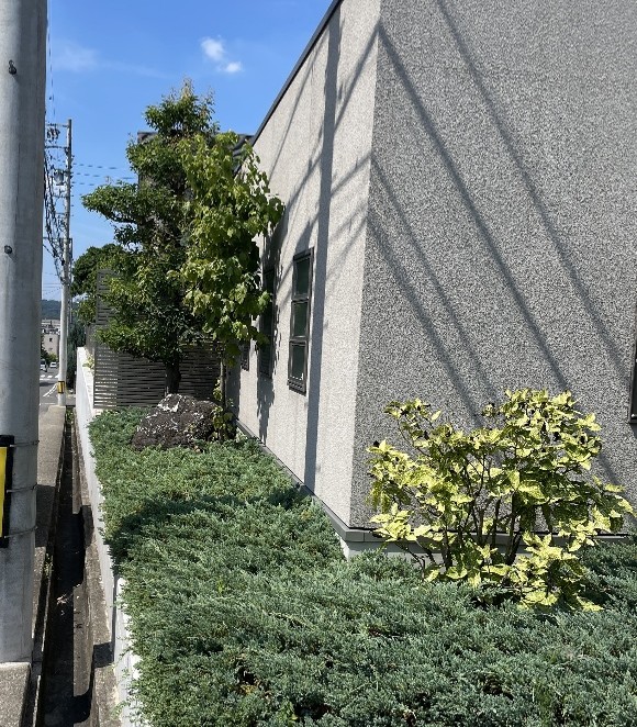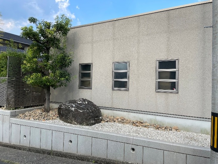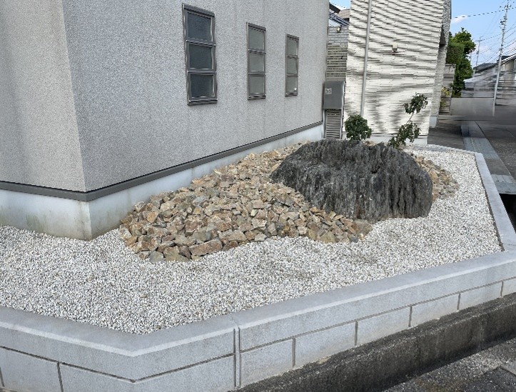 道路に面したオープンガーデンがいつの間にか緑が生い茂り、ハチの巣が4つも出来てしまいました。ご家族や通行される方の安全のため、岩や石、植物を組み合わせた和風ロックガーデンへとガーデンリフォームされました。 もともとあった大きな岩と縁起の良い「万年竹」を残し山をイメージ。陸に見立てた石は「割グリ石」、海に見立てた砂利は「小原砂利」を採用されました。 防草シートを敷き雑草対策も万全、蜂の巣もできにくい、すっきり見通しの良い安心で落ち着いた和風オープンガーデンに仕上がりました。